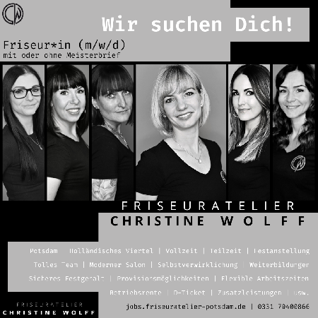 Friseuratelier Christine Wolff Ihr Friseur im Holländischen Viertel Aktuelle Trends, Neuigkeiten, Kundenaktionen rund um Ihr Haar StellenanzeigeFriseur/in gesucht weitere Informationen Wir retten die Ozeane - Teilnahme am Projekt "Hair Helps The Oceans"Wir sammeln Haare, Plastik, Alufolie & Korken weitere Informationen Seite 1 von 15 123456